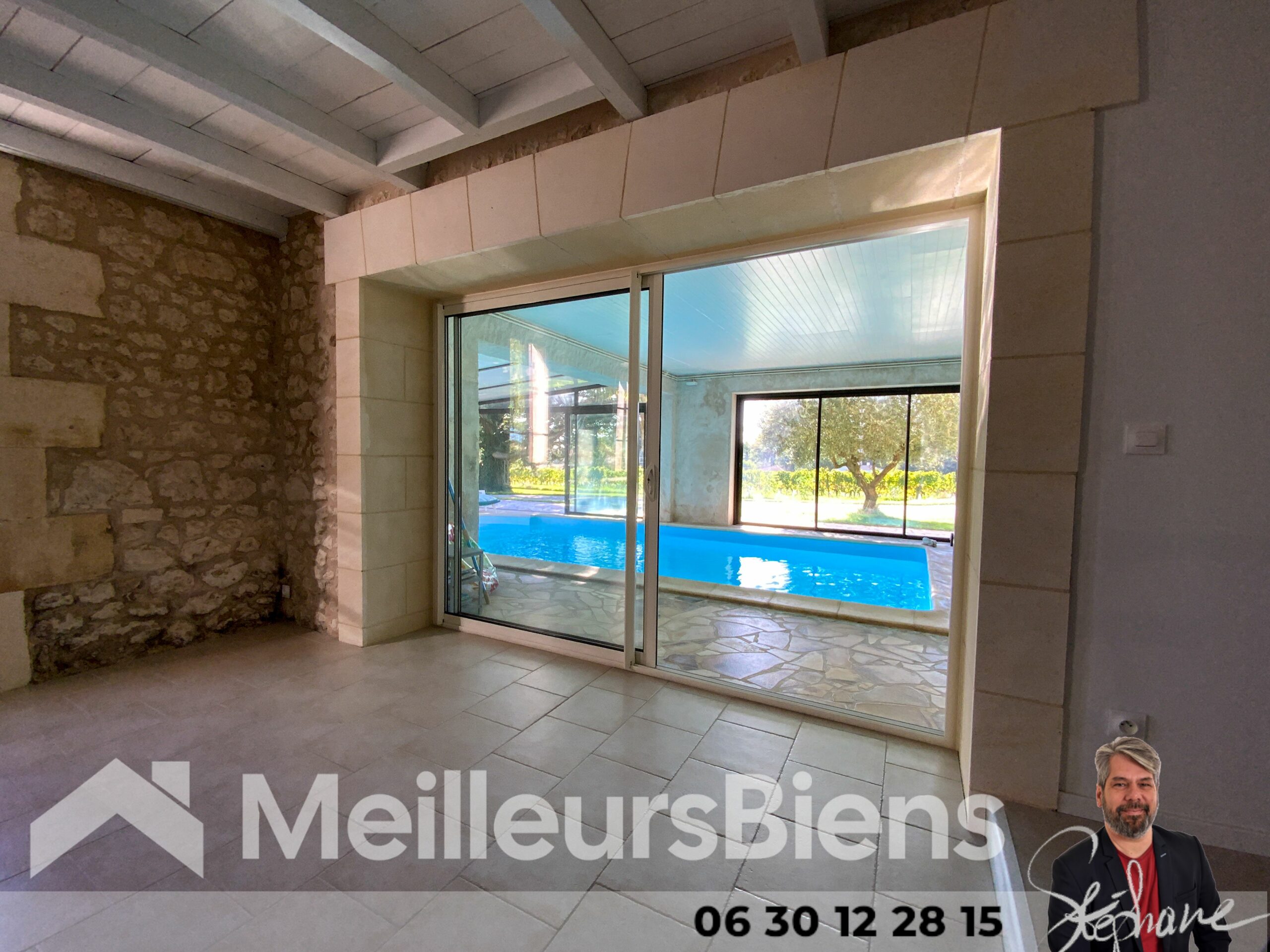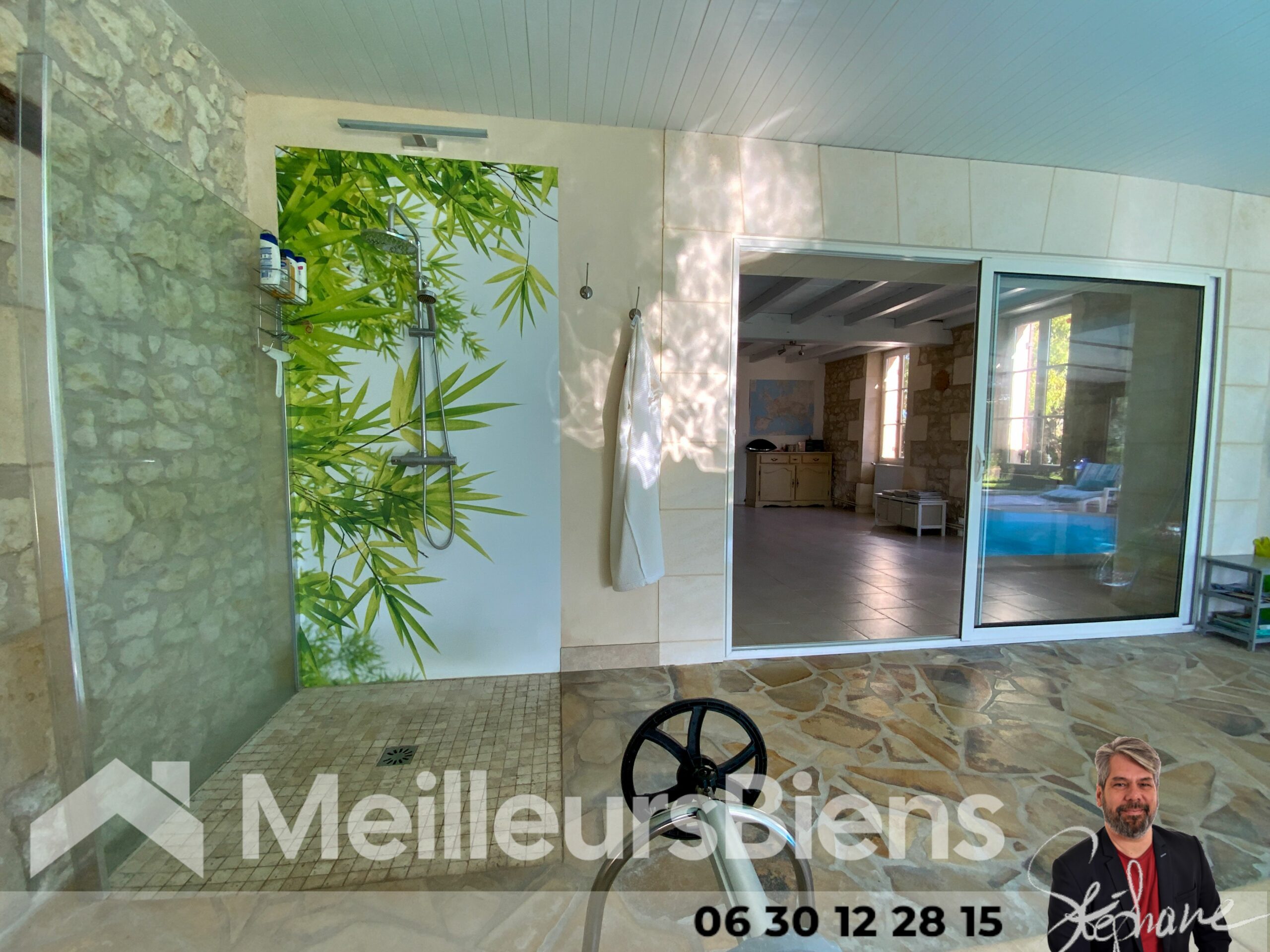 One hour from Bordeaux, Angoulême, or Royan, renovated traditional house with five bedrooms, including a master suite. Recent condensing heating, thermodynamic water heater, soapstone masonry stove, separate living area.